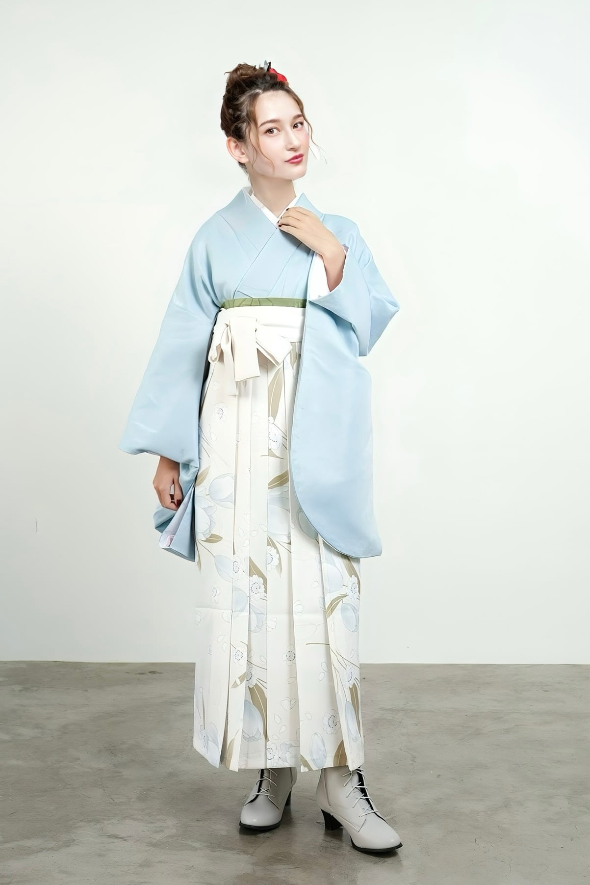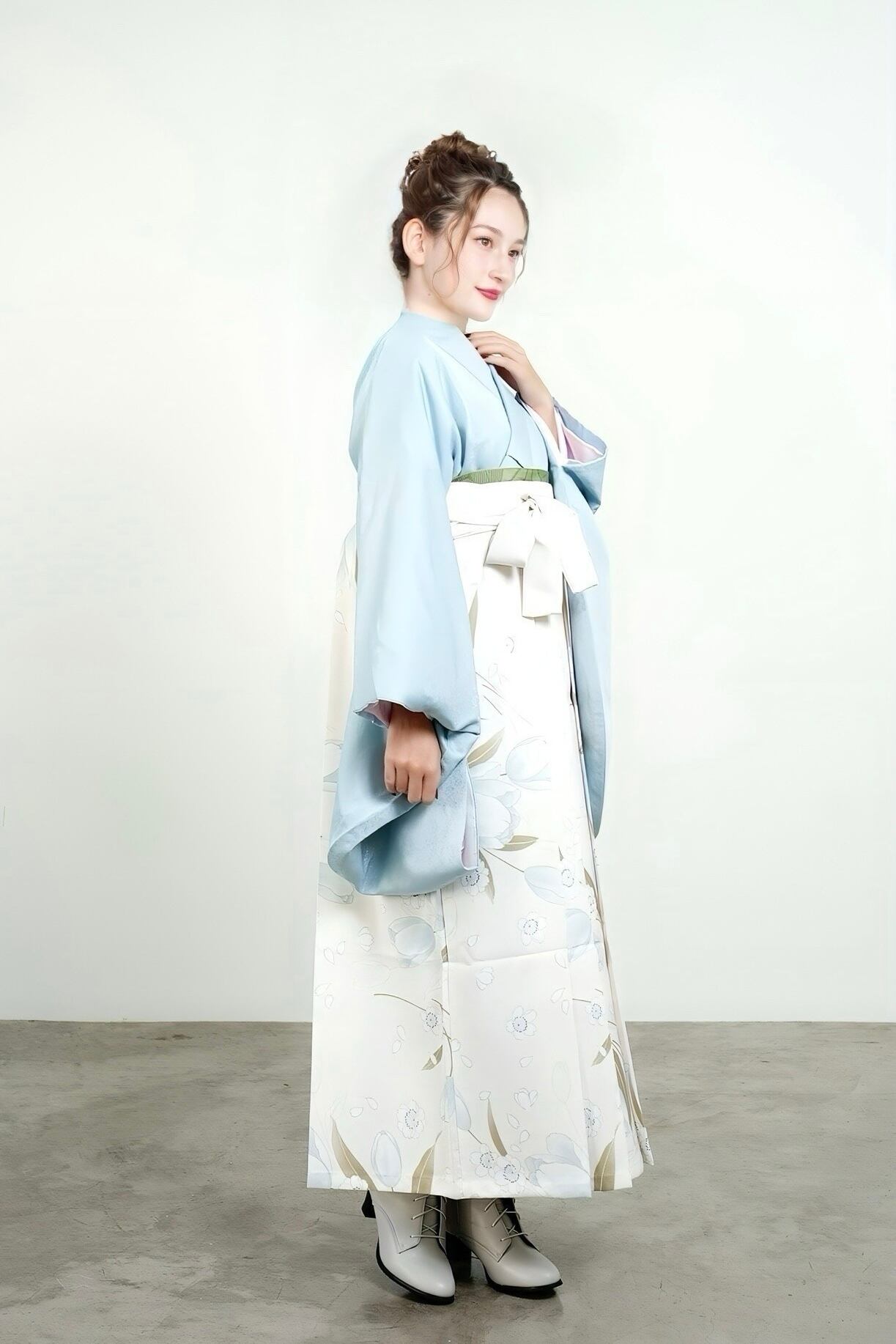 Kimono Sienne 卒業式袴3点セット ジャガード二尺袖×チューリップ柄袴 二尺袖着物 袴 卒業式 ライトブルー オフホワイト 着物ジェンヌ