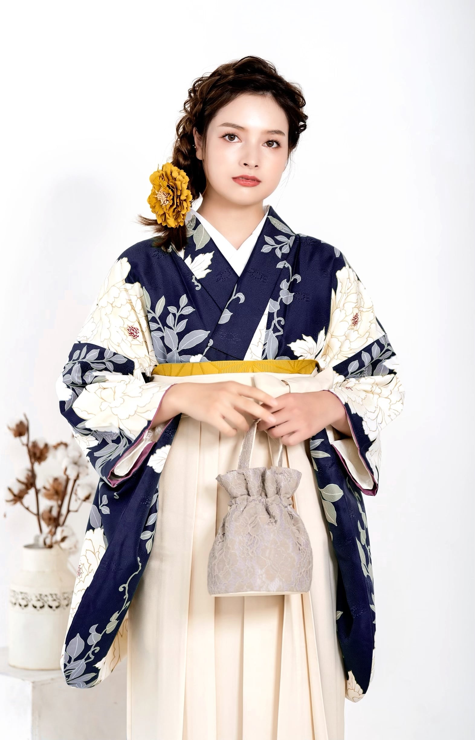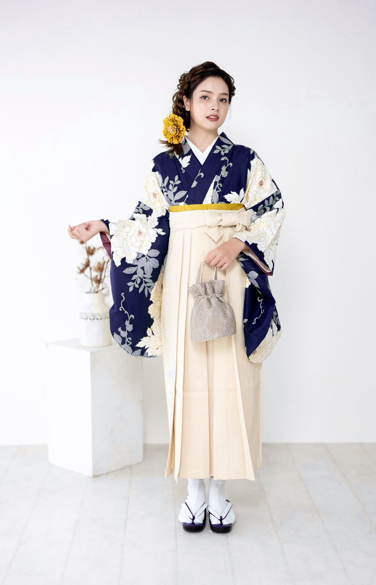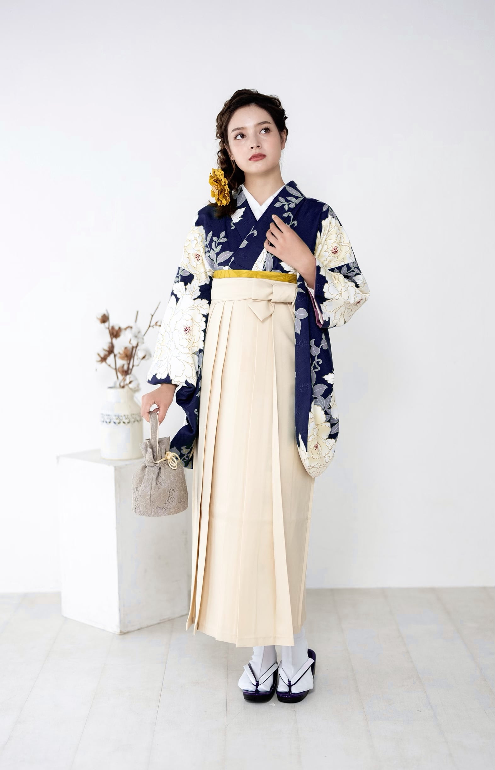 Kimono Sienne 卒業式袴3点セット ネイビー×アイボリー 牡丹 袴 二尺袖着物 袴 卒業式