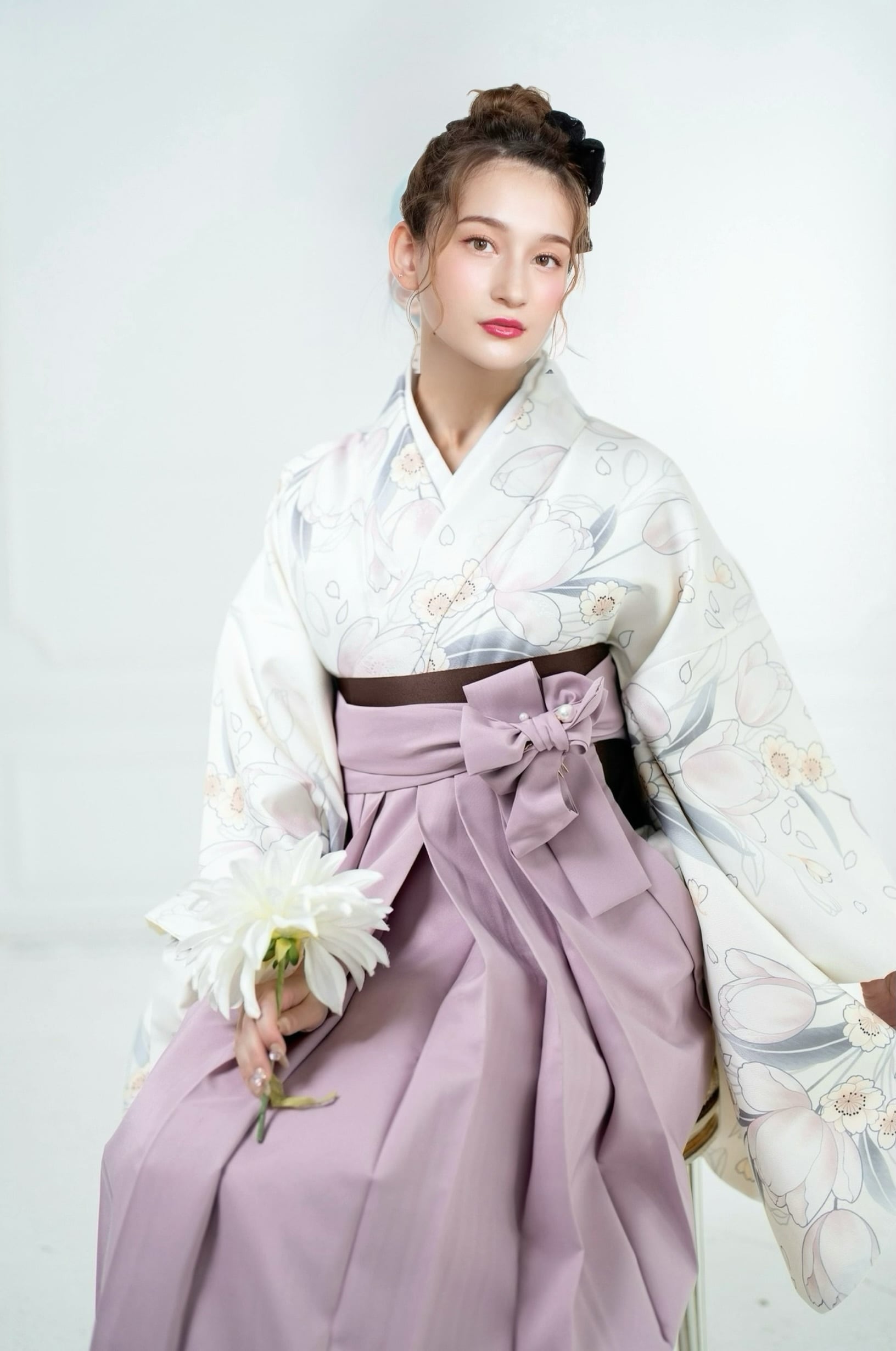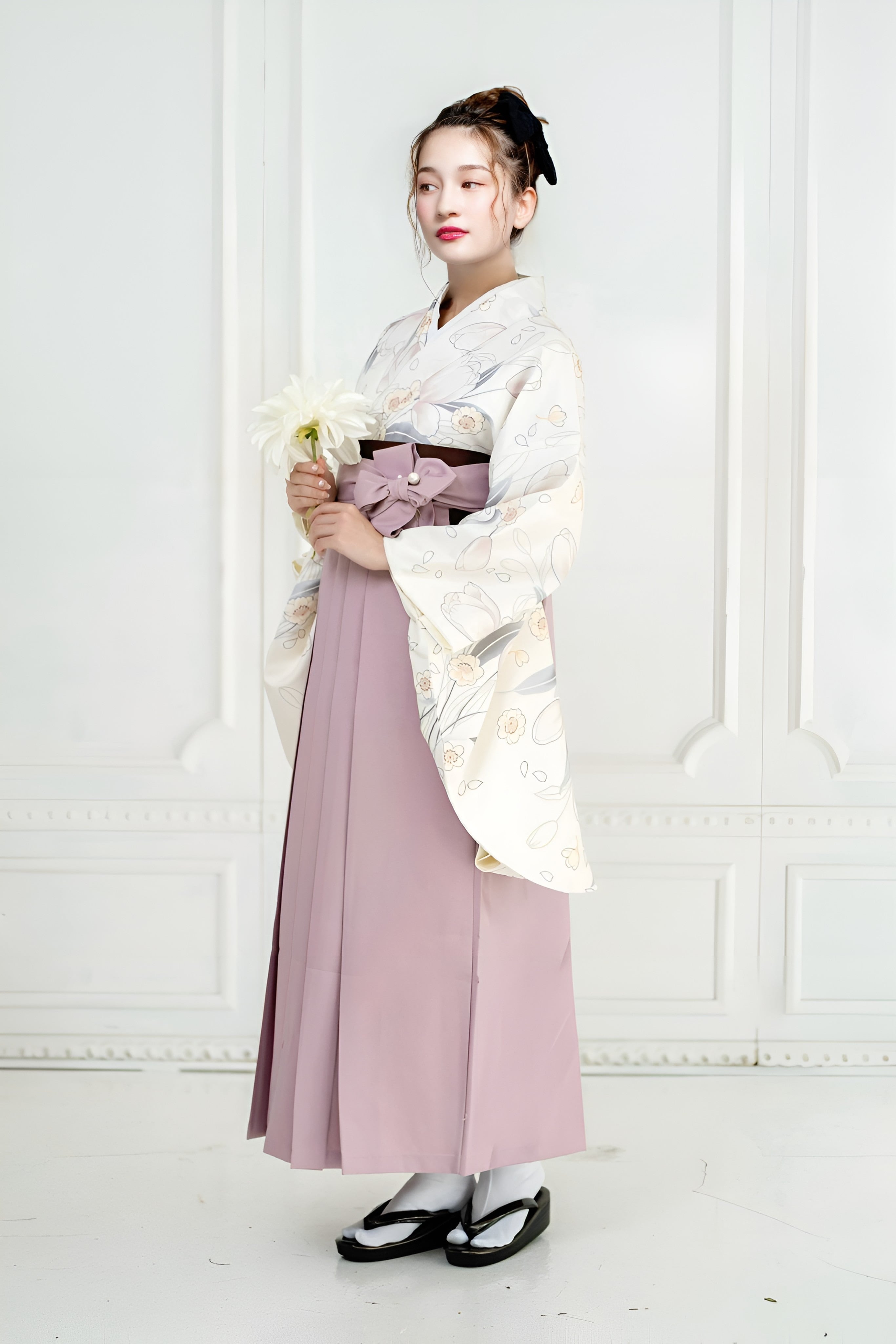 Kimono Sienne 卒業式袴3点セット 白 チューリップ 二尺袖着物 袴 黒 卒業式 大学卒業式 小学生 レディース袴 着物ジェンヌ